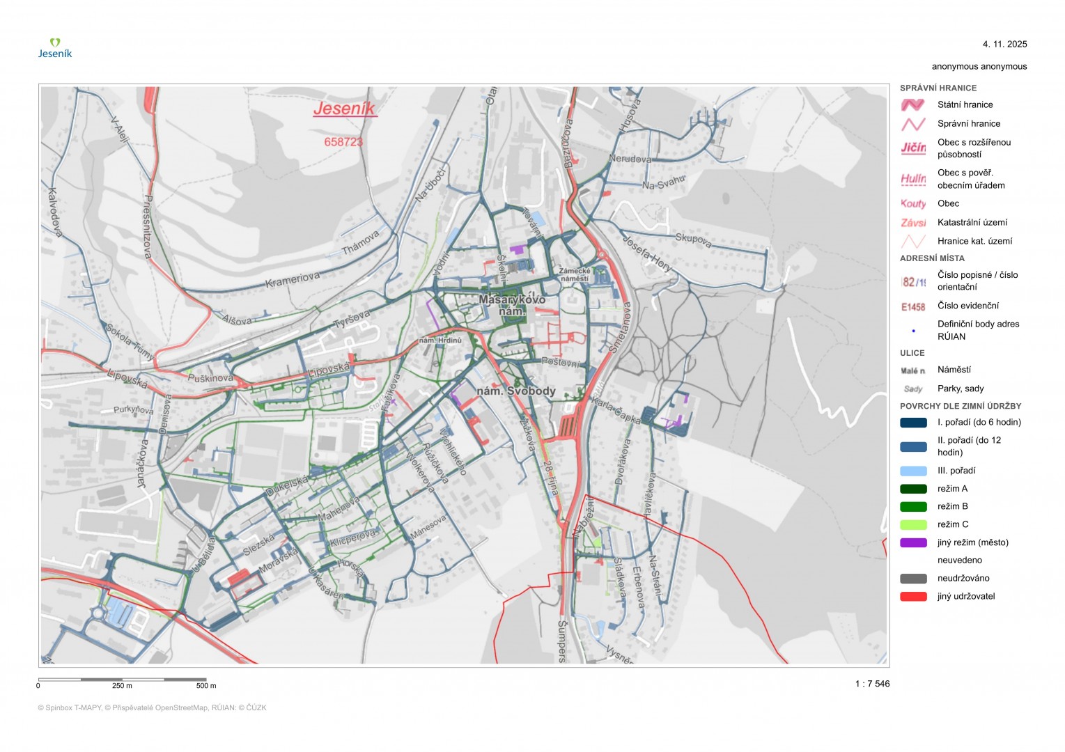 Upozorňujeme, že zimní údržbu zajišťují pracovníci technických služeb pouze na místních komunikacích ve správě města. Hlavní silniční tahy I., II. a III. třídy (např. ulice 28. října, Lipovská, Priessnitzova, Rejvízská aj.) jsou v zimním období udržovány Správou silnic Olomouckého kraje nebo ŘSD. Správců komunikací je však více, včetně soukromých subjektů, a toto rozdělení platí také pro chodníky. V mapě jsou tyto úseky označeny červeně.